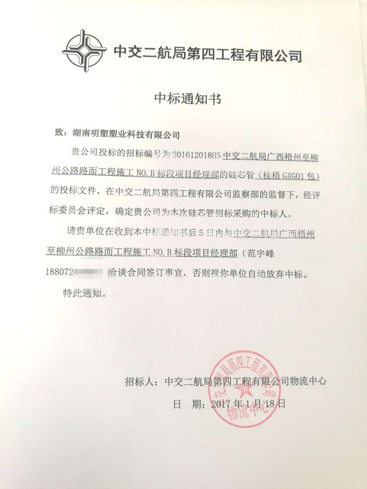 沿印松機(jī)電項(xiàng)目硅芯管中標(biāo)通知單
